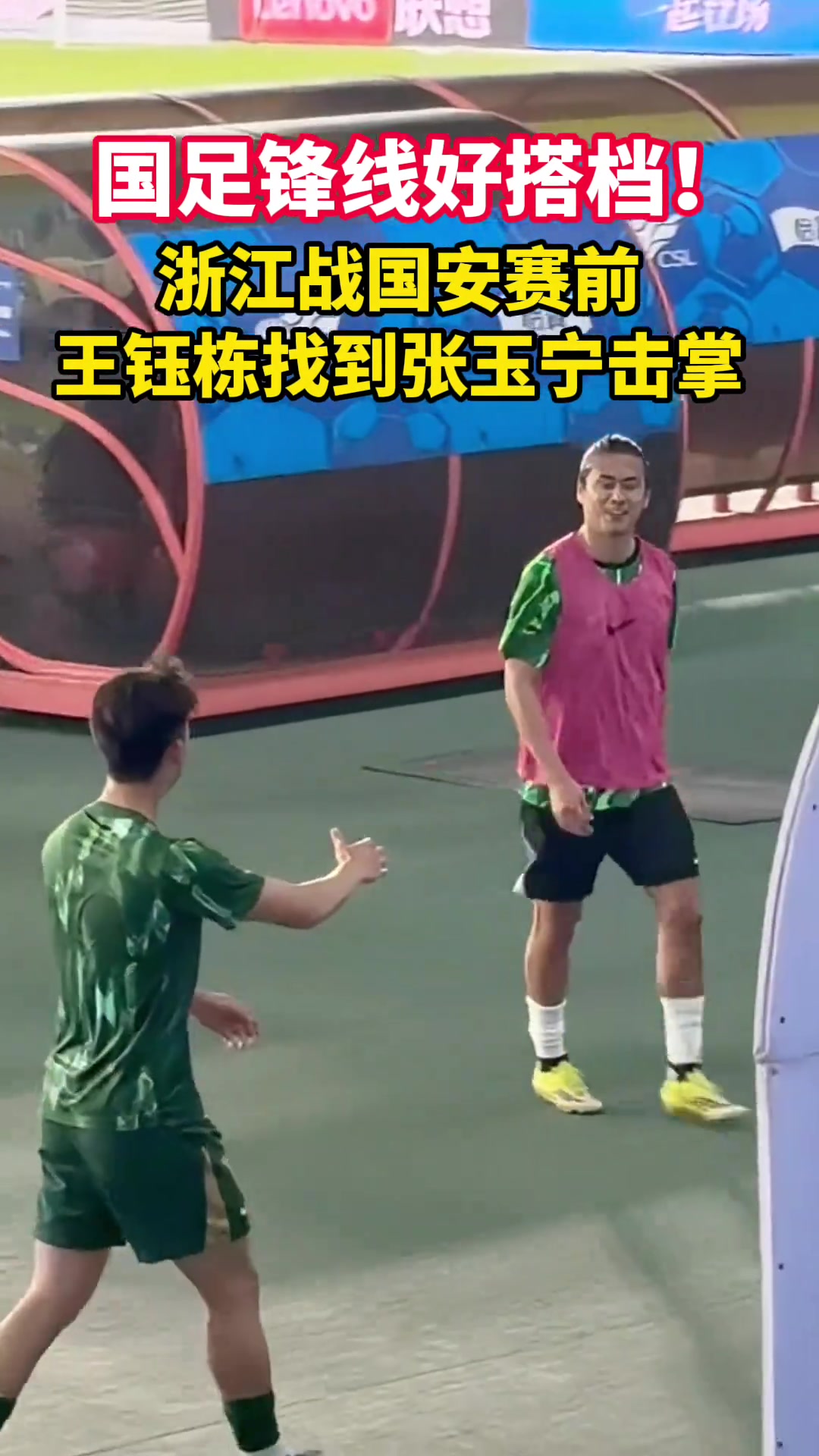 国足锋线组合PK!实拍:浙江vs国安赛前王钰栋和张玉宁击掌